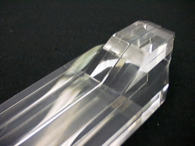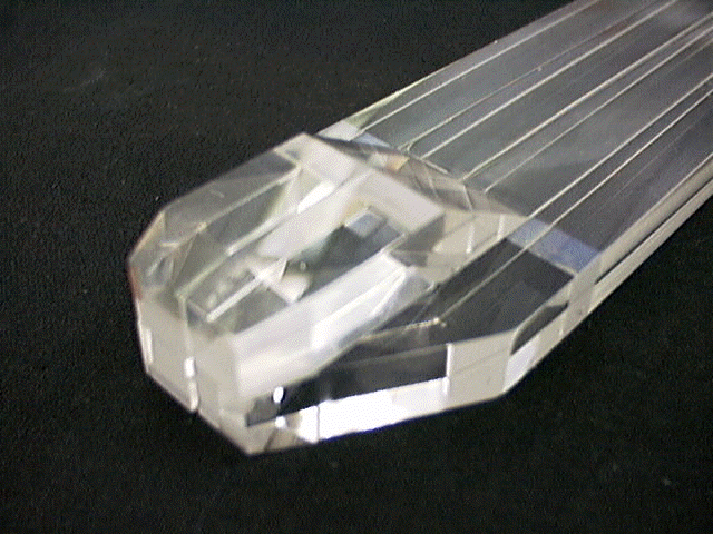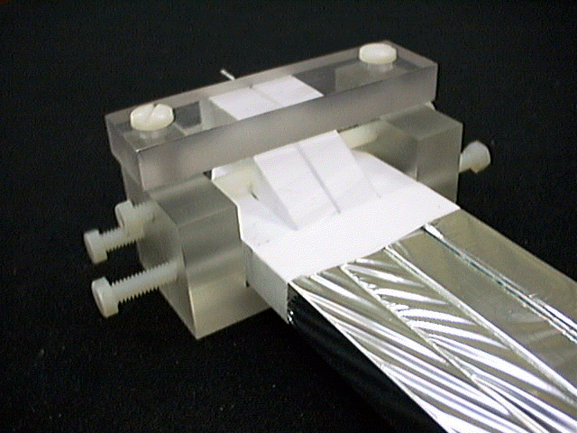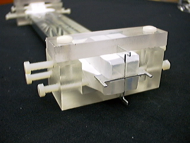 Bare scintillator assembly, showing the light-guide configuration used to connect the 4x1 scintillator geometry to the 2x2 photomultiplier geometry.