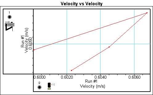 Because both the motion sensor and the photogate are measuring the same motion, it would be expected that the data from both the motion sensor and photogate would correspond with each other. Figures 7 and 8 are the velocity-velocity graphs for runs 1 and 3. The velocity-velocity graph for each run plots the velocity measured by the motion sensor against the velocity measured by the photogate.