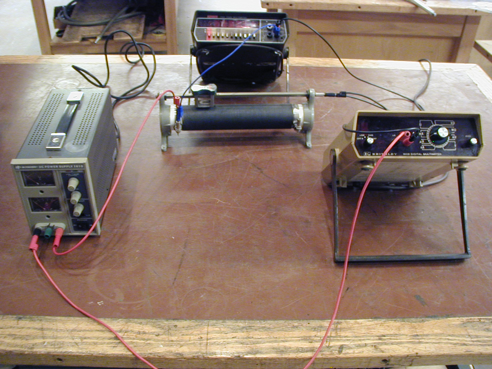rheostat, ammeter, and a power source are connected in series. A voltmeter