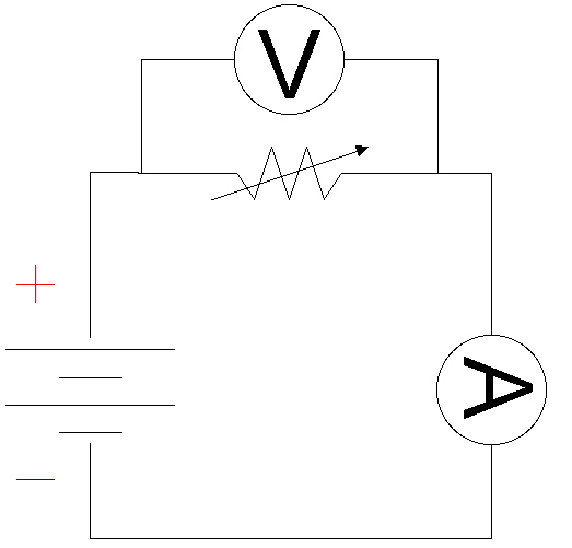 voltmeter, center: rheostat, bottom left: battery, bottom right: ammeter.